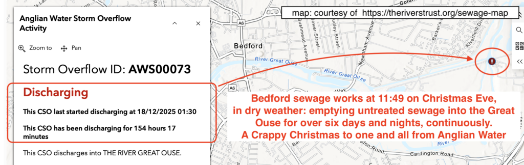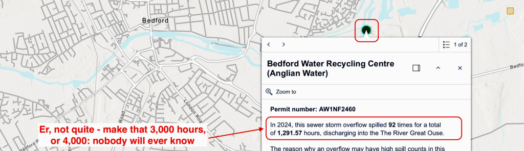 Anglian (motto: “Love Every Drop”) just admitted to me that at Bedford its spill monitor was only working for a few weeks of 2024 – in January, February and December – and that the Ofwat-certified 1,291 hours had not been averaged-up, those were merely spills recorded in the weeks the monitor functioned. The true figure could have been 3,000 hours, or 4,000, no-one will ever know, and a year only has 8,760 hours. Anglian pours so much untreated sewage into the Ouse from its Bedford WRC that it perfumes it to mask the stink, but locals complain the cheap scent smells worse than the ordure.