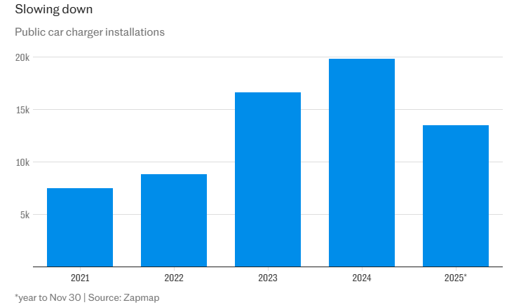 Figures from Zap Map, which provides data to the Office for National Statistics, show that 13,469 were installed by the end of November this year, compared to a total of 19,834 in 2024.