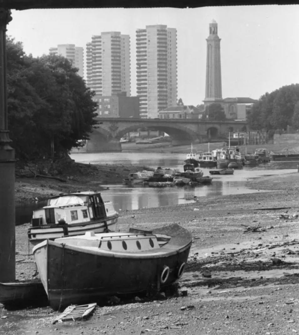 76 is still the hottest summer I have ever experienced in the England – a gloriously warm sea at Bournemouth for at least a month, or more – daily forest fires in the New Forest, some huge and lasting days – so hot that even hand out the window while driving made no difference. Below is a picture of the Thames which has not been this dry, probably for a very long time, or since.