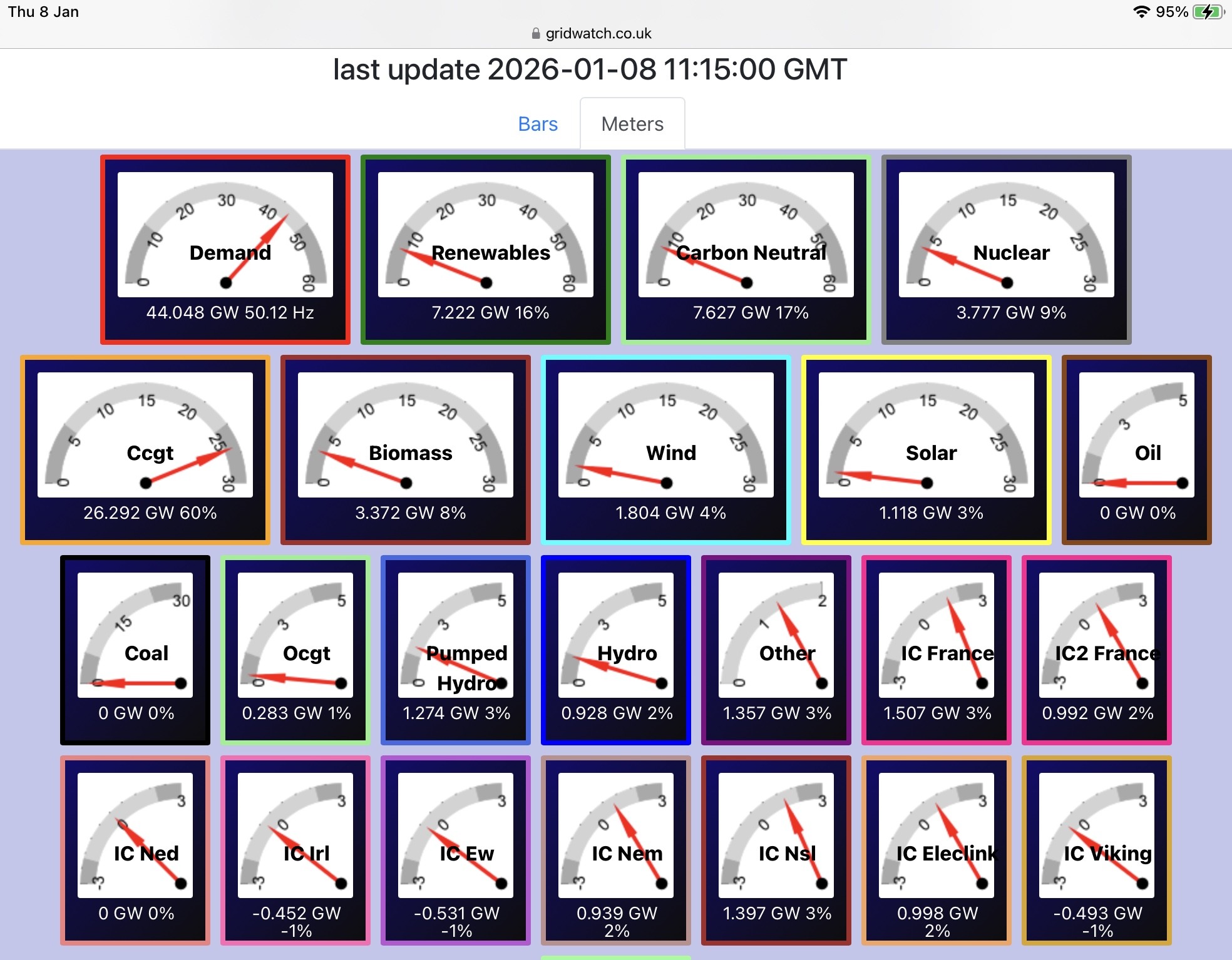 So, as I write, over 50% is gas generated and 15% imported. I’m sad, I know, but I am fixated on the graphs and pie charts on the subject but on the site I use, energy dashboard, it doesn’t break down how the imported stuff is generated, so it could be actually filthy brown coal from Germany, sold into the European market and then sold on to us by the French, Dutch and others. In fact, anything from continental Europe must allow for the coal element, because it’s just a big pot of electricity moving around, with no distinction, but Milibrain never admits to this.