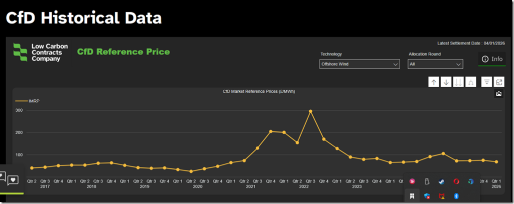 It has probably occurred to you that we are now in 2026! Since 2024, CPI has risen by 4.5%. As CfD strike prices are index linked, that “£90.91” has already risen to about £95 per MWh.