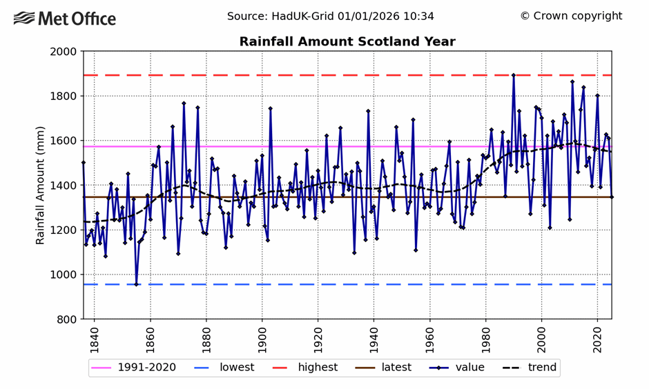 No attempt was made to question Otto’s bonkers claim that “every time it rains now, it rains more than it would have without climate change”. Not in Scotland, Harford might have noted, the rainiest country in the United Kingdom. As the Met Office graph below shows, the amount of Scottish rainfall has flatlined for about 40 years.