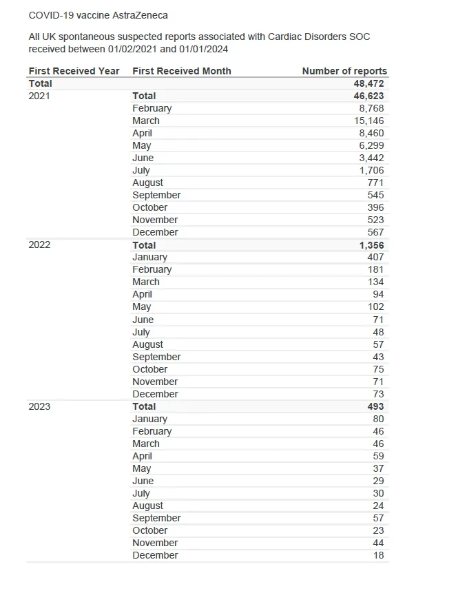 I seem to recall that during the Covid outbreak, it was estimated that only around 10% of incidents are reported to Vaers (in the USA) or the yellow card system in the UK. That 48,000 figure for reported heart conditions could easily be nearly 1/2 million.