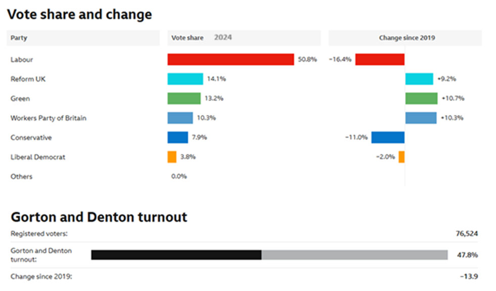 The BBC chart below compares the results for the Gorton and Denton constituency for the 2024 election with those from 2019. Turnout was a pathetically low 47.8%, highlighting the lack of enthusiasm for any of the candidates. While Labourβs candidate, Andrew Gwynne, won 50.8% of the vote, this represented only 24.3% of the electorate.