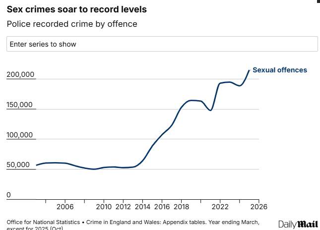 The number of sex offences reported to police has jumped to a record high of 214,816, official figures show. This includes 74,265 rapes, up 7% in a year and the highest number on record. The Mail has more.