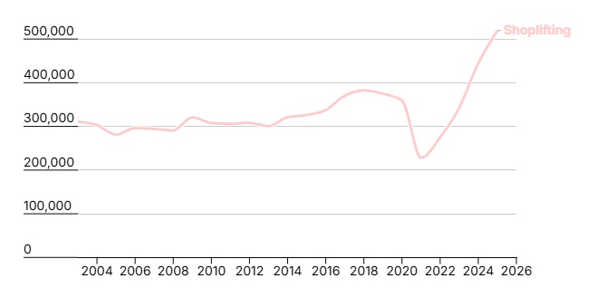 Cases of shoplifting reported to police climbed five per cent year-on-year to 519,381.