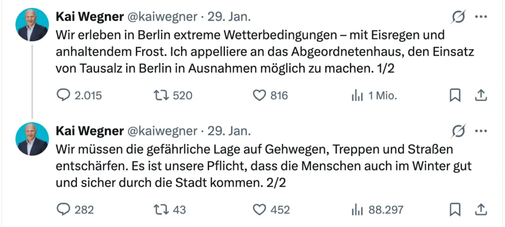 This morning, Berlin’s hapless Governing Mayor Kai Wegner appealed to the House of Representatives “to allow the use of de-icing salt in exceptional cases” to “alleviate the dangerous situation”. After everybody had a good laugh at Wegner for his impotent social media appeals, the man discovered that he is actually in charge of the whole executive and that he can just do things: