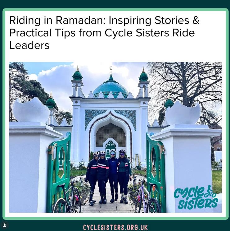 Examples include Evolve, “The Cycling Network for Muslim Women”, and Fasted 500, “an annual cycling challenge encouraging Muslims to keep active during the month of Ramadan by pledging to ride 500 kilometres”.