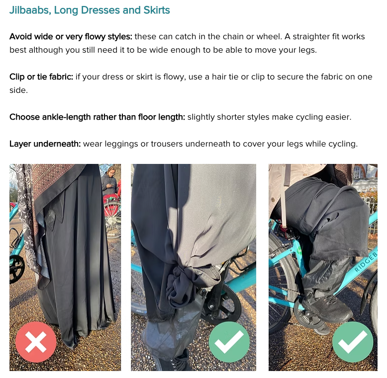 The charity maintains that it helps women overcome barriers such as “Negative cultural attitudes” and “Racism and Islamophobia”. Its website is packed with resources, such as an article on how to cycle in modest clothing: