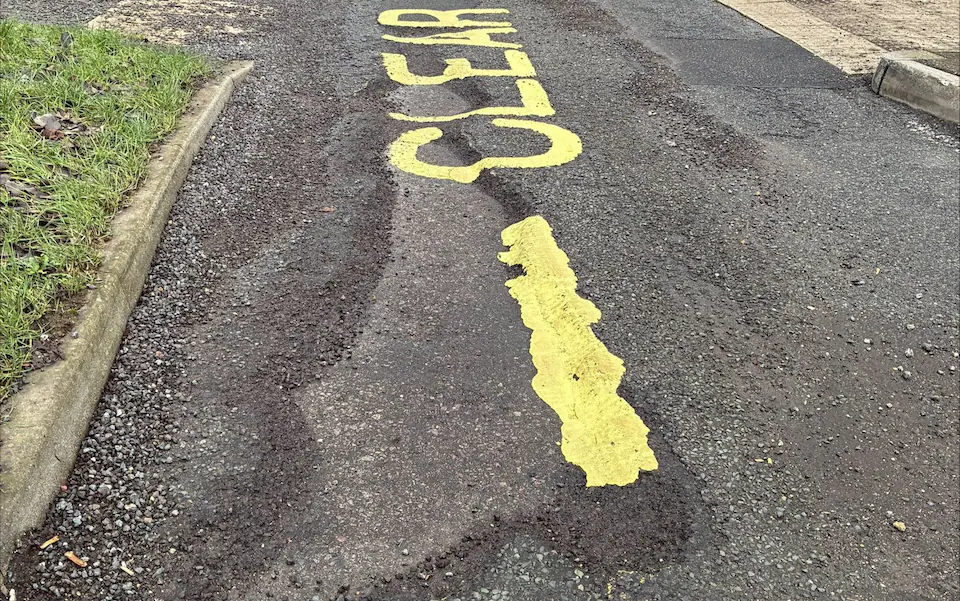 After a series of complaints, a number of the holes were filled in with tarmac, leaving the freshly painted road markings, warning ‘school keep clear’ obscured by the newly laid black tarmac.