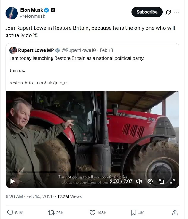 Elon Musk Endorses Rupert Lowe’s New Political Party Restore Britain