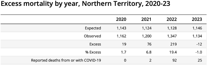 Four of Australia’s states and territories are the focus here. They all experienced excess deaths during the pandemic. I noticed that, no doubt partly because of the country’s relative isolation and natural oceanic borders, in the regions of Queensland, Western Australia (WA), South Australia and the Northern Territory (NT), deaths from COVID-19 only became a (relatively) big deal from 2022 onwards. For example, there were no COVID-19 deaths in the NT in 2020, the crucial pandemic year before the vaccines arrived, and a whopping two COVID-19 deaths in 2021, comprising a very small proportion of overall excess deaths, with double digit COVID-19 deaths in the following years (see table below). WA even saw COVID-19 deaths decrease from 2020 to zero in 2021, before shooting up in 2022, when everyone was supposed to be ‘protected’ by the vaccines. Weird, huh?