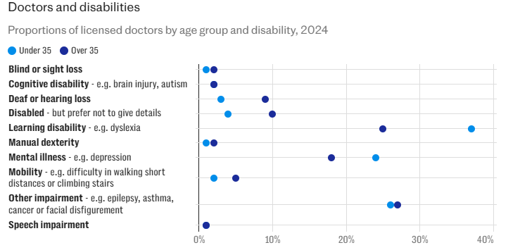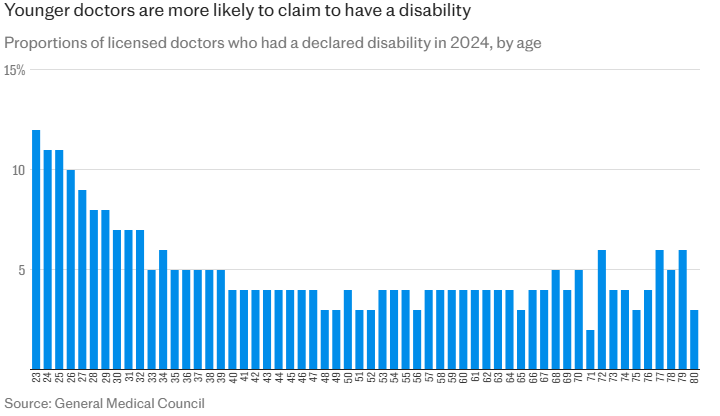 Some 13% – more than one in eight – British doctors under the age of 35 now claim to be disabled, which is more than double the 6% of doctors aged over 35.