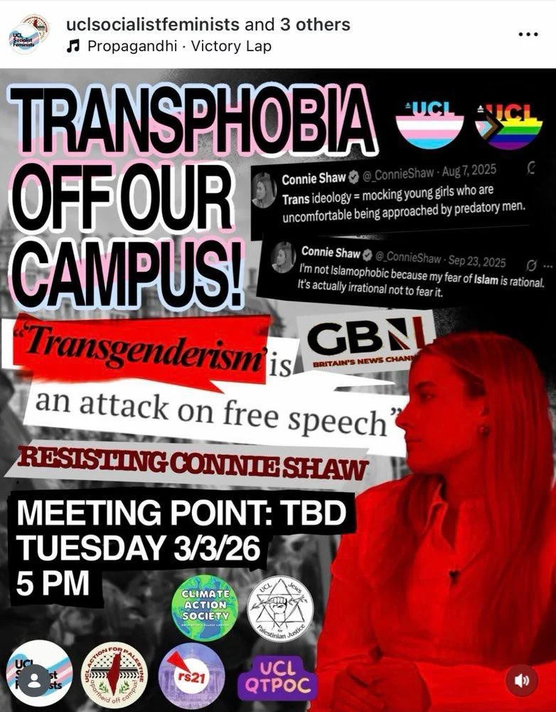 The day before the event, a protest was organised and advertised on Instagram by “UCL Socialist Feminists” and “Action for Palestine Society” – calling me “transphobic” and “Islamophobic”.