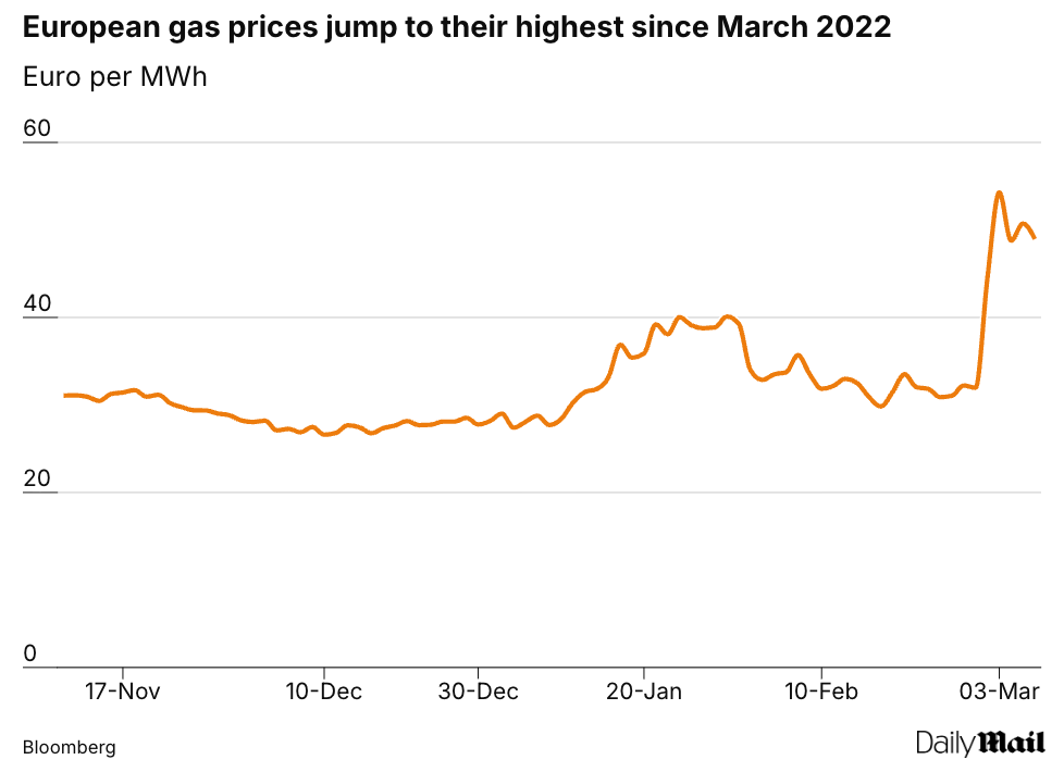 Disruption to the gas market is driven partly by the near-total closure of the Strait of Hormuz, through which around 20% of the world’s natural gas and oil flows, and also by the shutdown of production in some places.