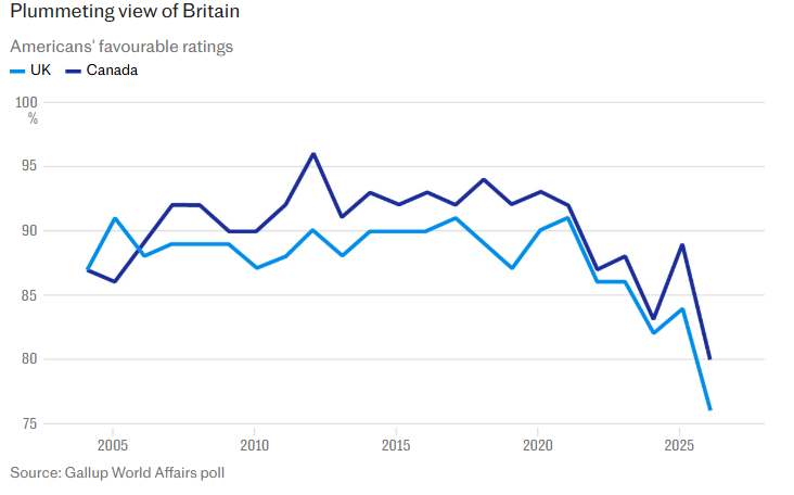 The share of Americans who have a positive view of the UK has plummeted to 76% this year from 84%, according to polling by Gallup.