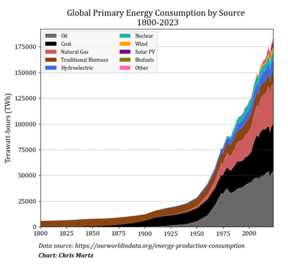 This point was very much brought home to me by our own Tilak Doshi in a recent article titled ‘Barclays Sounds the Alarm on Renewable Energy’. He observed that renewable energy had become additive, not substitutive. Illustrating the point with the following chart showing global energy consumption by source since 1800.