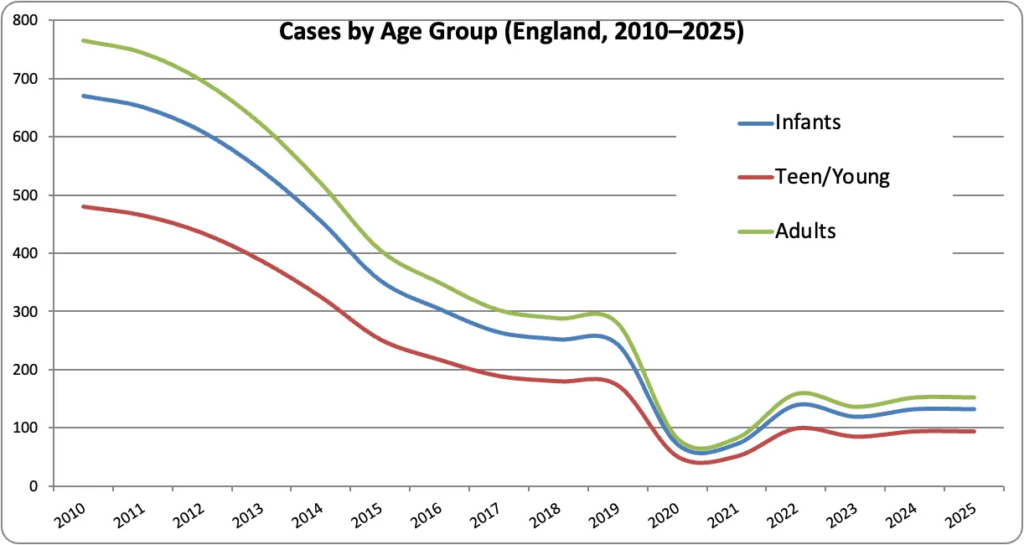 Based on UKHSA annual surveillance reports (2010-2025), the number of meningococcal cases in England decreased significantly, from approximately 1,915 in 2010 to 1,010 in 2015. This downward trend continued more gradually, reaching below 700 cases by 2019. In 2020, the number of cases dropped dramatically, largely due to COVID-19 restrictions. Following this decline, cases began to rise again, stabilising at roughly 340-400 per year.