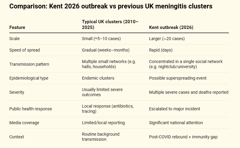 The Kent 2026 meningitis outbreak differs from previous UK patterns in both scale and dynamics.