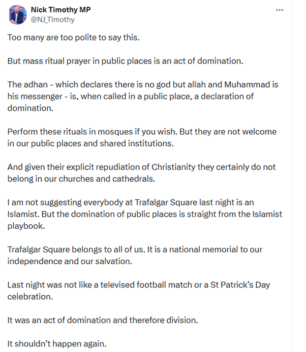 British politicians have a noted aversion towards telling the truth – so much so that, whenever one slips up and finally does so, he is immediately called upon to resign. That was the fate awaiting Nick Timothy, the Conservatives’ Shadow Justice Minister, when he posted the following honest tweet about an Islamic takeover of Trafalgar Square during Ramadan, in which assembled Muslims bowed down before Mecca and loudly recited the adhan call to prayer, justly describing it as “an act of domination” of the public sphere. What else should we expect from a religion whose name quite literally means “submission”?