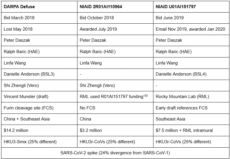 - Technical Area 2 of DEFUSE (e.g. furin cleavage site) became NIH U01AI151797. (ResearchGate and Sachs-Haslam WHO letter).