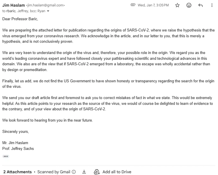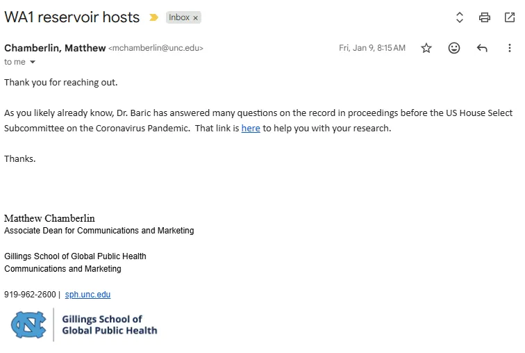 Professor Ralph Baric was provided an opportunity to comment on this draft prior to publication. Matthew Chamberlin, the Associate Dean for UNC Communications, responded, “Thank you for reaching out. As you likely already know, Dr Baric has answered many questions on the record in proceedings before the US House Select Subcommittee on the Coronavirus Pandemic. That link is here to help you with your research.” That link led to six hours of Baric’s testimony, in which he never provided an alibi.