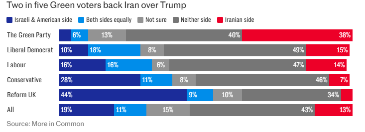 Green Party voters are far more likely to back Iran rather than Israel and the US in the war in the Middle East, with 38% sympathising with Iran versus just 4% with the US and Israel, a poll has shown. The Telegraph has the story.