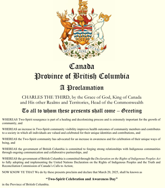 I realise many readers may have missed the fact as they were too busy being forced to celebrate Ramadan by Sadiq Khan, but March 20th, the Islamic holy day of Eid, was also another important non-white holy day elsewhere in the British Commonwealth, too. Over in Canada there now exists a new homosexual holiday of very recent provenance called “Two-Spirit Celebration and Awareness Day“. If that sounds uncomfortably like a formal celebration of state-sanctioned schizophrenia, then you’re right – the whole confection is basically a ‘Native Tranny Deification Day’. If you don’t believe such a thing could possibly ever exist, then feast your eyes on this official proclamation from the Province of British Columbia, made in the explicit name of King Charles III, in an open spirit of “healing and decolonisation”.