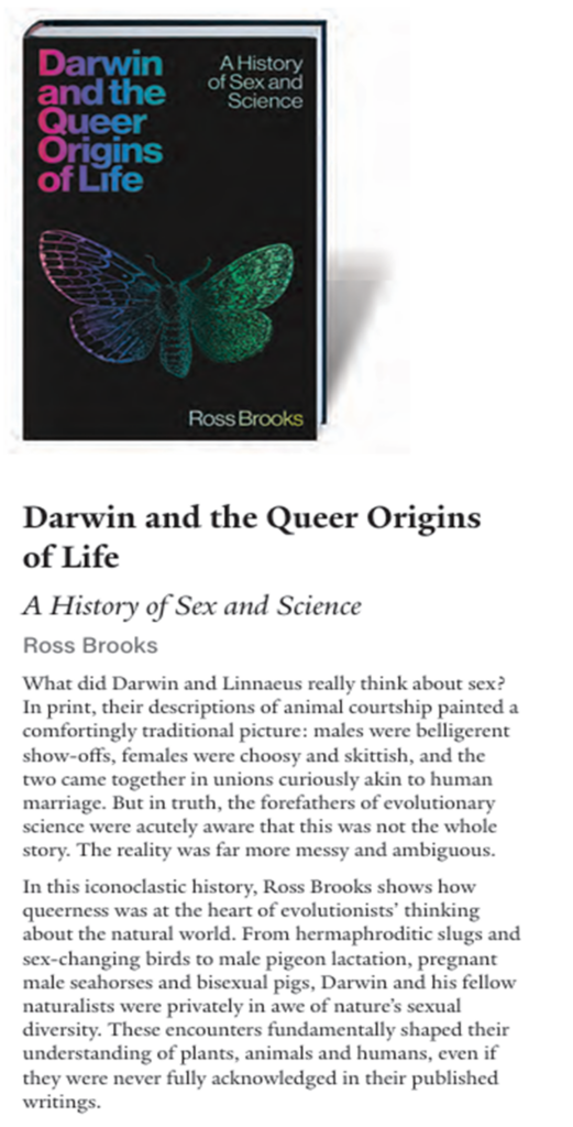 Did life on Earth really have “Queer Origins”, though? Are amino acids, amoebas and infusoria really members of Stonewall and GLAAD? Isn’t it a commonplace of Mother-Father Nature’s ways that homosexuals cannot generally reproduce? I don’t know if the author realises this fact, but Elton John’s ‘son’ didn’t just drop out of his bum one day. But then, maybe the author doesn’t realise this fact, as he/him is Ross Brooks, an “independent historian of science and foundational thinker in queer history and the history of sexology” – hence his expert knowledge about “hermaphroditic slugs”, “male pigeon lactation” and “bisexual pigs”, who are surely both Pinky and Perky simultaneously. His website features truly laughable stuff like this: