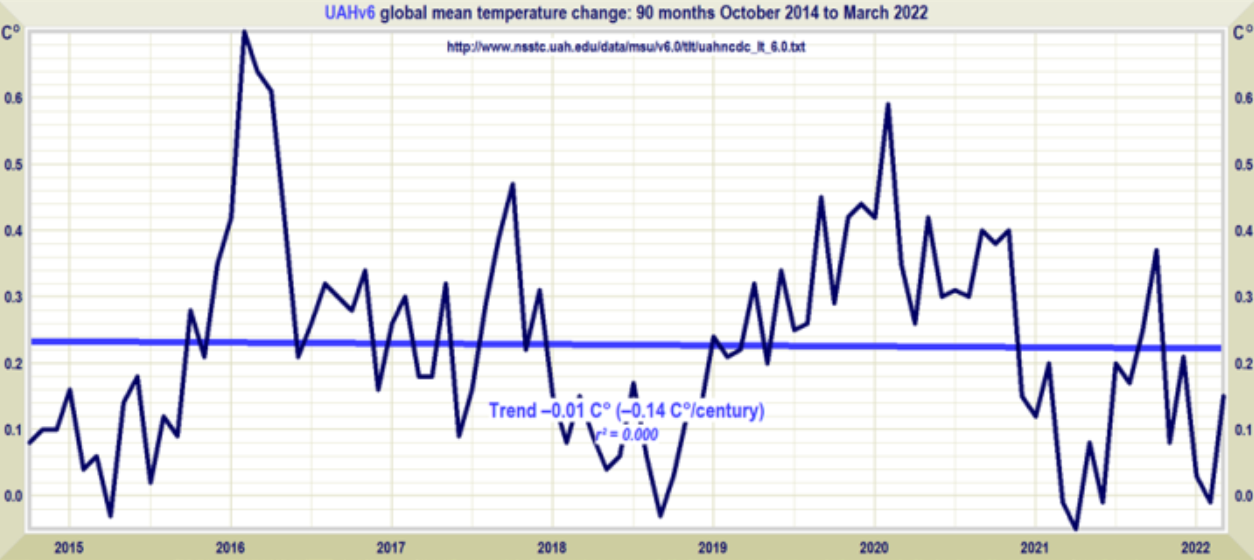 The global warming pause is now 90 months long. In fact, a small cooling movement is now discernible, since the trend measured over the last 90 months is minus-0.01°C, which equates to minus-0.14°C a century.