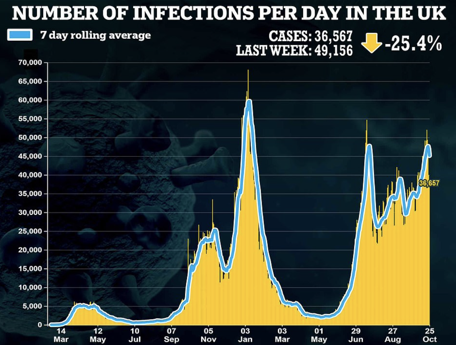 Daily Covid infections in Britain have fallen again and deaths are also down, easing the pressure for the Government to implement 'Plan B'. Starmer picked a bad day to call for more working for home.