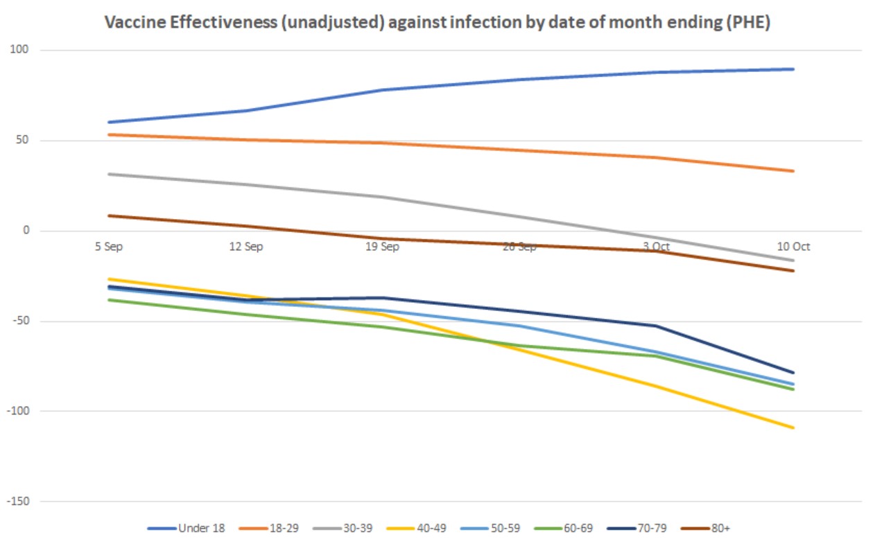 The latest PHE vaccine report sees unadjusted vaccine effectiveness hit minus-109% in people in their 40s, with older age groups not much better.