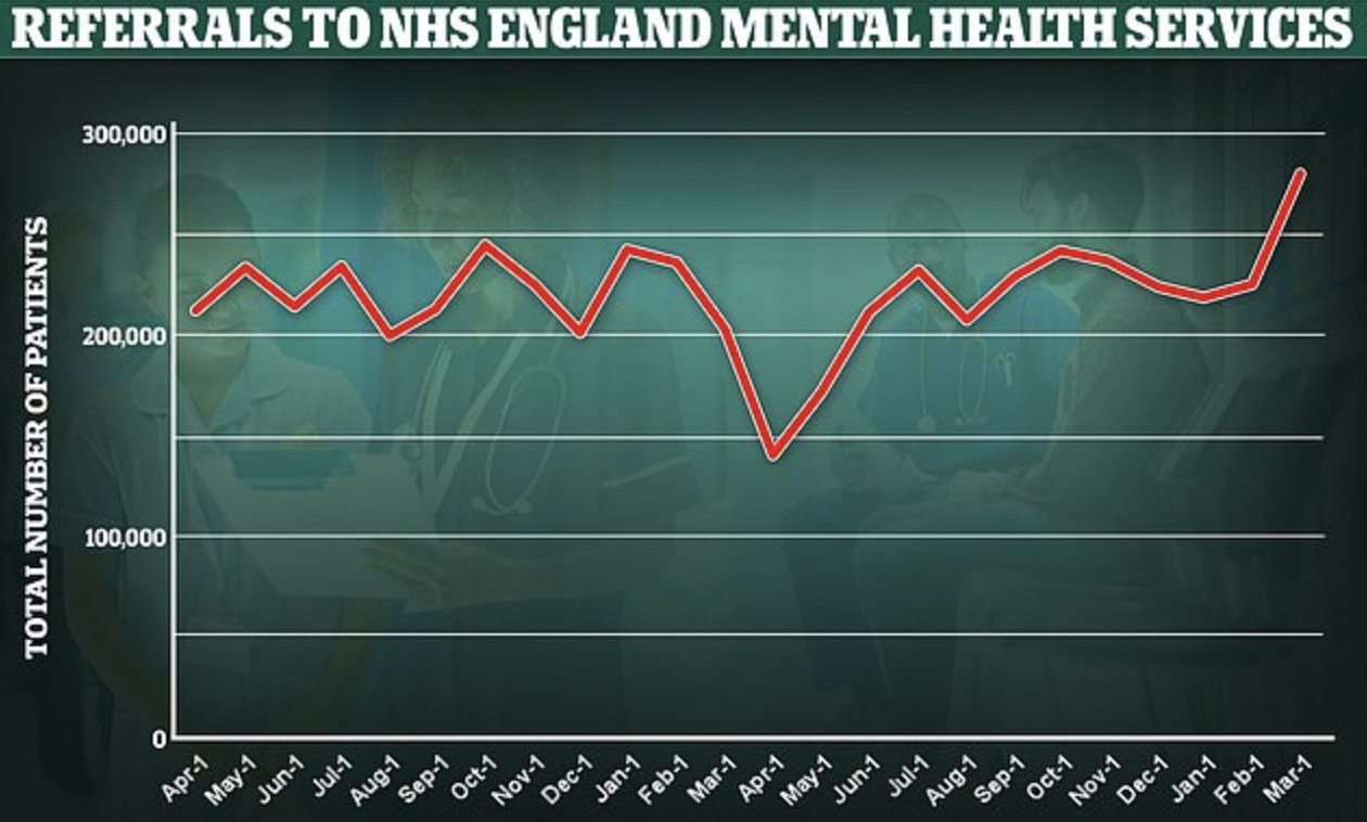 The was a spike in the number of mental health referrals in the U.K. in March 2021 compared to February 2020, before the onset of lockdowns. At the same time, the number of patients actually receiving care has fallen.
