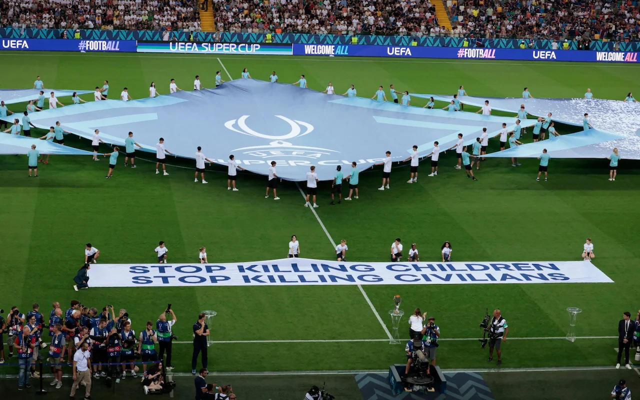 UEFA has been blasted for rolling out a "Stop Killing Children" banner before the Super Cup, with Jewish groups saying it plays into an age-old antisemitic slur and breaches its own rules on political messaging.
