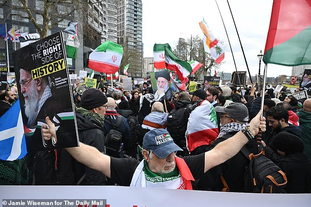 Thousands have packed a London Al-Quds rally, waving Palestinian flags and portraits of Iran's leaders and brandishing "Boom boom Tel Aviv" placards, as speakers praised Iran and denounced the West.