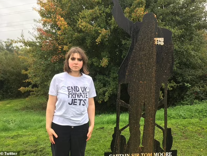 A nutty green protestor has prompted fury over her odd decision to pour a bucket of human excrement over a memorial to Captain Sir Tom Moore in a protest over the use of private jets.