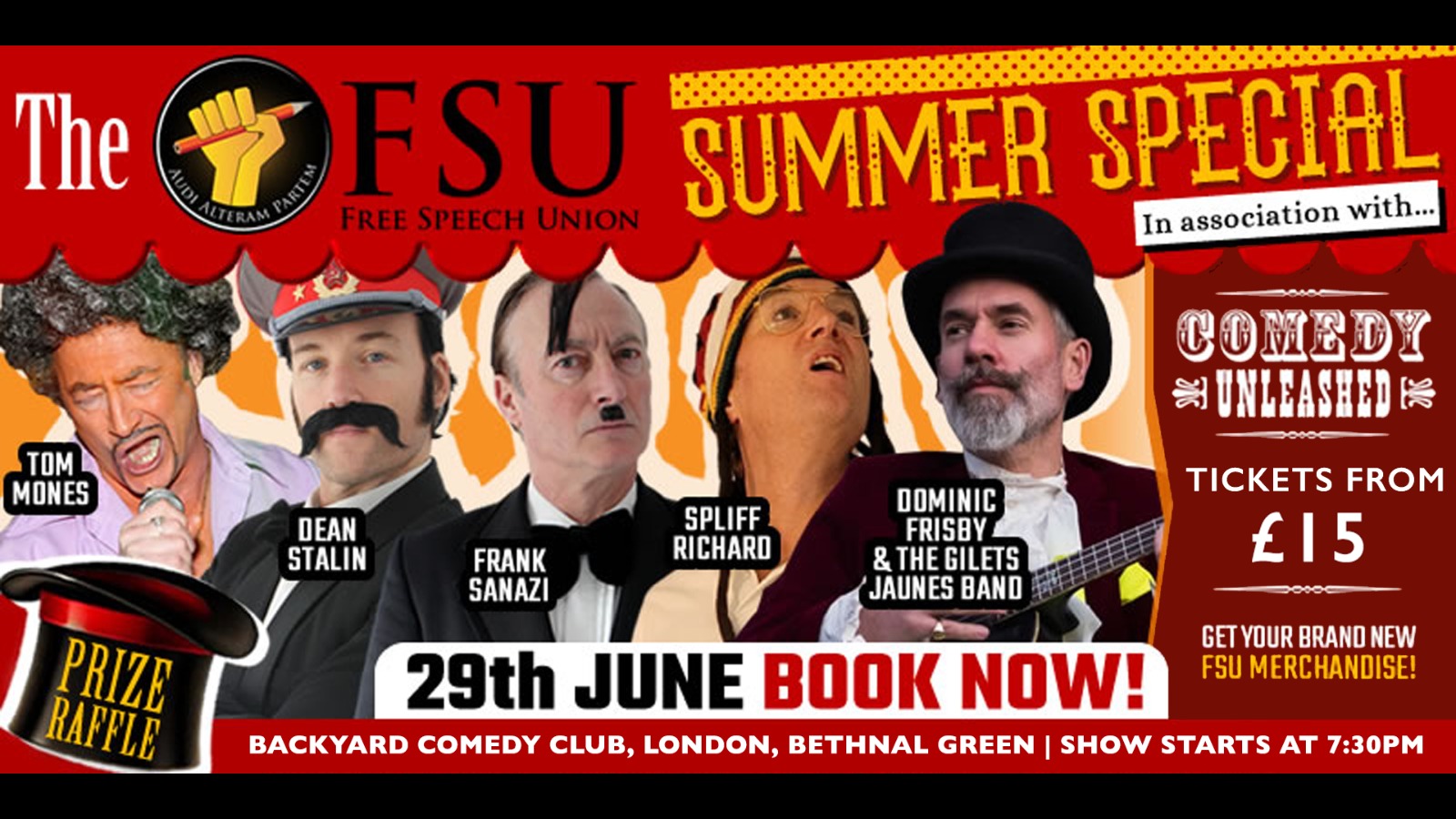 The Free Speech Union is hosting a fundraiser tonight at the Backyard Comedy Club. Click below to buy tickets. Prices start at £20.