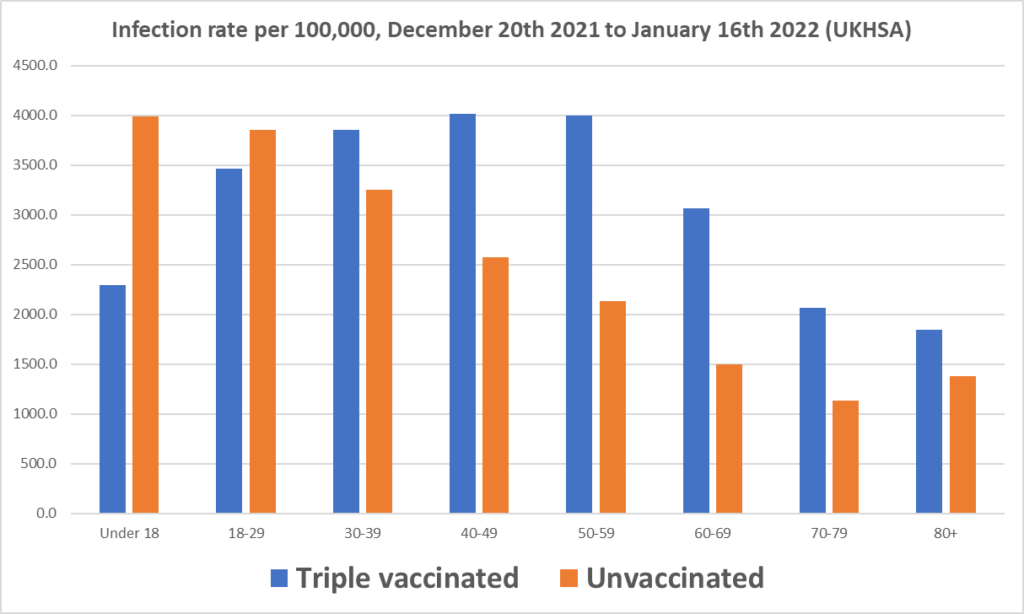 Unadjusted vaccine effectiveness against infection is negative against Omicron for the triple-jabbed over-30s, new UKHSA data show, meaning infection rates per 100,000 are higher in the triple vaccinated.
