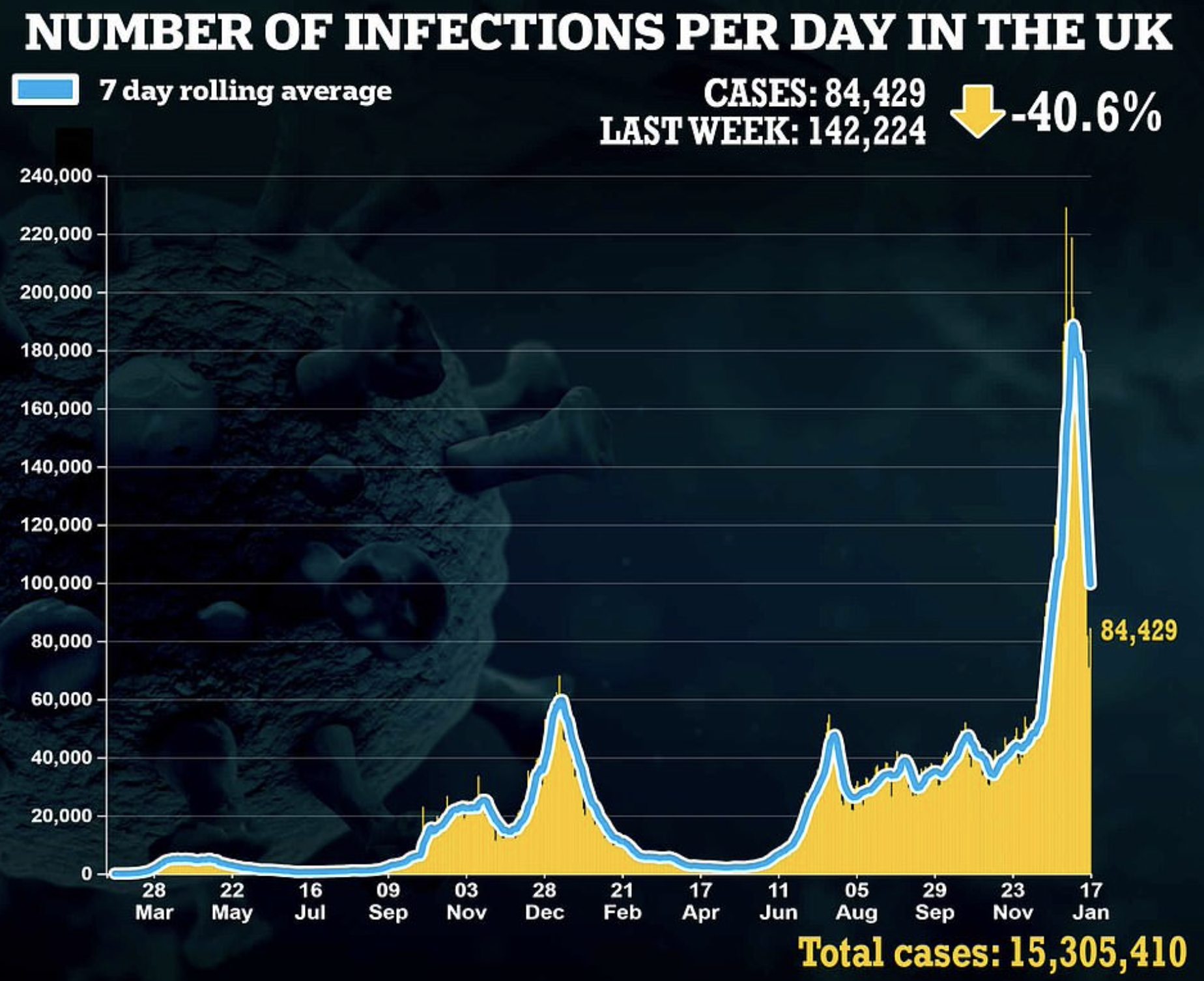 Britain's daily Covid cases plunged for the 12th day in a row – down 41% week-on-week – as the Omicron wave continued to collapse and workers headed back to offices in their largest numbers since it took off.