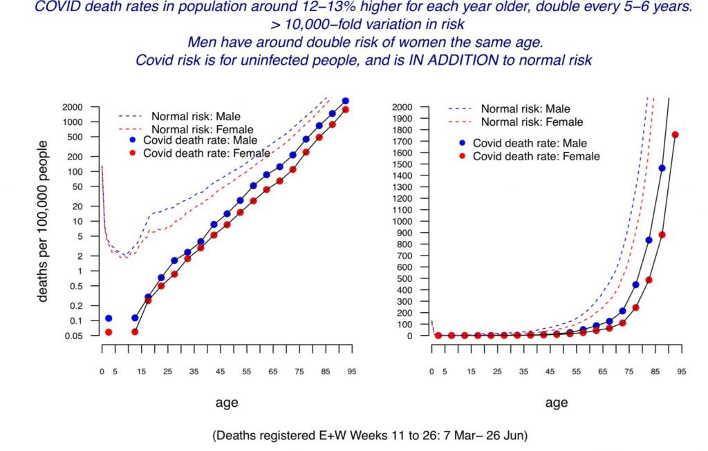 It also varies considerably between ages and depending on the presence of underlying conditions. Cambridge Professor of Statistics David Spiegelhalter has used the mortality data from the spring 2020 epidemic in England and Wales to show that the risk of dying from a COVID-19 infection roughly increases by 12-13% for each year older, doubles every 5-6 years and is around 10,000 times higher for the oldest compared to the youngest. It is also roughly proportional to the normal risk of dying in a given year (though is partly in addition to that normal risk). Men have around double the risk of death of women of the same age.