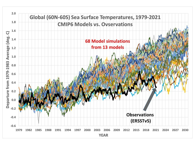 Let us start with an irrefutable example of the inability of climate models (general circulation models, GCMs) to provide meaningful projections. Climatologist and former NASA scientist Dr Roy Spencer compares observed global sea surface temperatures with those predicted by climate models and provides an analysis (Fig.1). This shows unequivocally that warming is occurring much more slowly than the average model says it should. Indeed, it can be seen by simple inspection that the climate models currently in use by the IPCC (CMIP6) exaggerate observed warming by a factor of up to around five times.