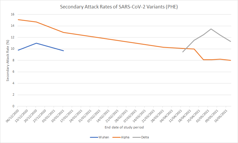When the infectiousness (secondary attack rate) of the Delta variant over time is plotted against that of other variants it becomes clear that claims it is hyper-transmissible make no sense.