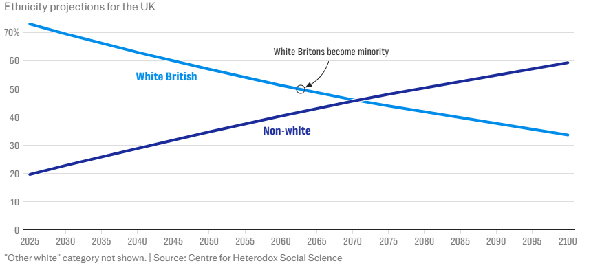 White British people will become a minority within 40 years, a report from Buckingham University's Professor Matt Goodwin has predicted. Turns out the Great Replacement isn't a conspiracy theory, just a demographic fact.