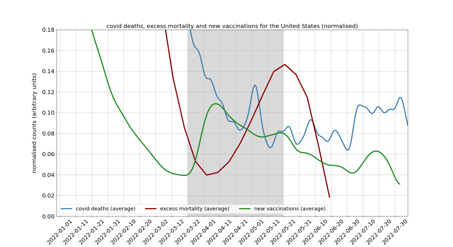 A graph shows a close correlation between when vaccine boosters were rolled out in the U.S. in the spring and a wave of excess deaths at a time of falling Covid deaths.