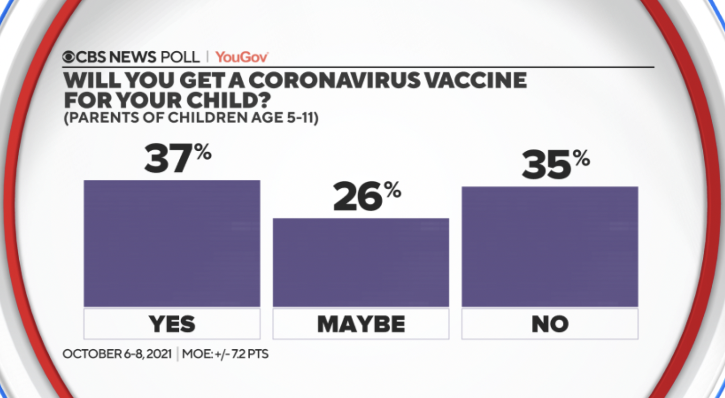 A new survey suggests that less than 40% of American parents with children aged five-11 plan on getting them vaccinated against Covid, while the rest are either opposed or haven't yet made up their minds.