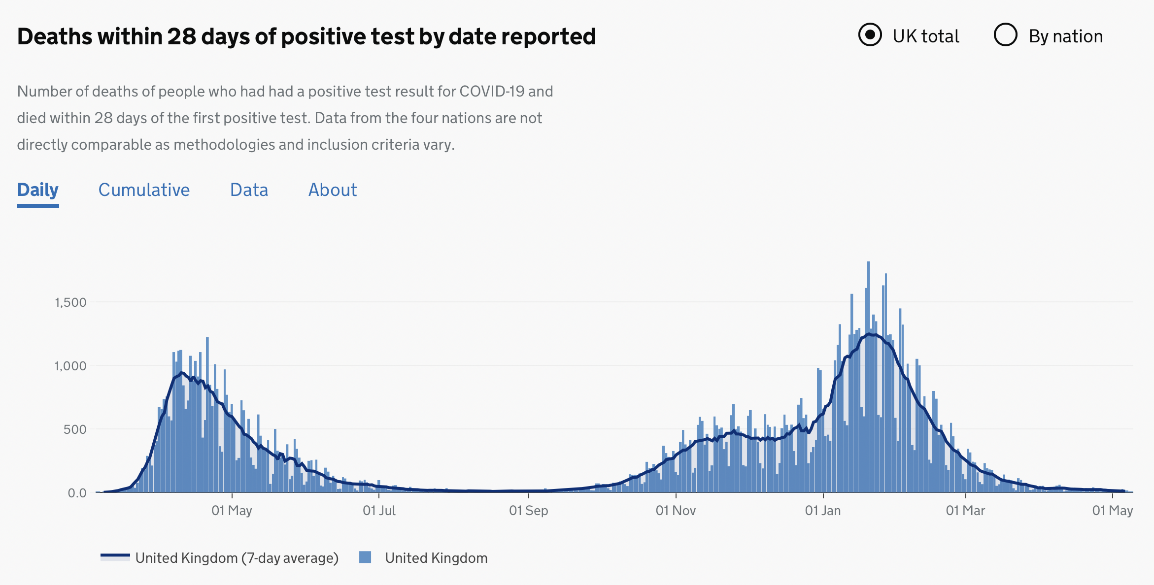 The number of Covid deaths has fallen by 86% in a week and just two deaths have been reported in the last 24 hours.