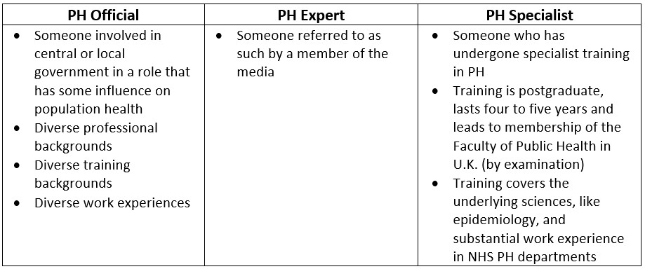 But is there any difference between a Public Health (PH) official, expert and specialist? Certainly you wouldn’t think so listening to most broadcast media. Here are my definitions: