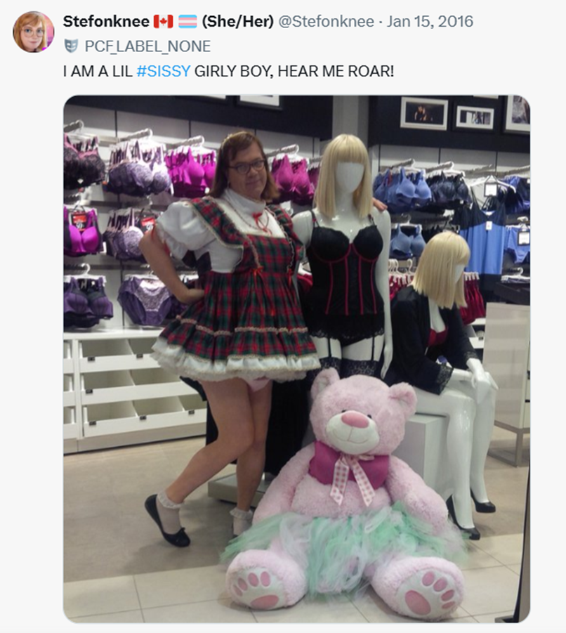 Where did Georgina Dawes meet his adoptive parents? At an orphanage? No. On a fetish-website. For a little girl, Stefoknee does appear to be disturbingly sexualised in his appearance. This is him out shopping in a Canadian lingerie department. Since when did eight year-olds buy lingerie? To even ask the question marks you out as a cruel, chrononormative bigot.