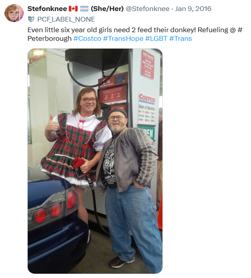 What would a world in which trans time found itself being tolerantly validated by the society around us actually look like? Like the wonderful world of “Stefoknee Wolscht”. Wolscht was a six-foot-plus tall Canadian man who suddenly realised, aged 46, that he was in fact an eight year-old girl called Stefoknee. Splitting from his wife and seven children, Stefoknee was ‘adopted’ by a polyamorous couple who agreed to treat him as their hormone-boosted ‘daughter’, letting him sit around in their house all day looking deviant. “It’s called play therapy. No medication, no suicide thoughts. And I just get to play,” Stefoknee purrs about existing like this.