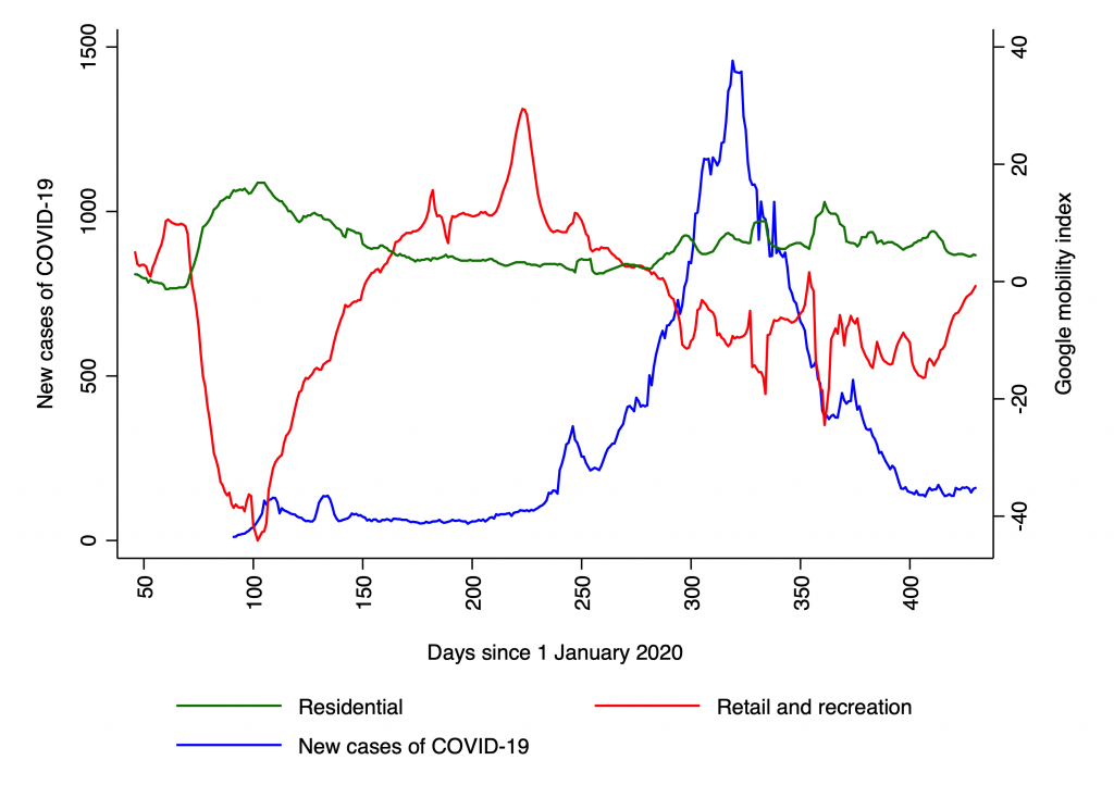 The chart below plots the daily number of cases in South Dakota since March 31st 2020, alongside the Google mobility index for residential, and the Google mobility index for retail and recreation. Each of these indexes quantifies the change in people’s movement relative to the baseline, based on smartphone data. For example, the mobility index for residential tells us how much more or less time than usual people were spending at home (–20 means 20% less; +20 means 20% more). Each line represents a seven-day moving average, so as to make the chart easier to read. (The two troughs in the red line around 350 on the x-axis correspond to Thanksgiving and Christmas, respectively.)